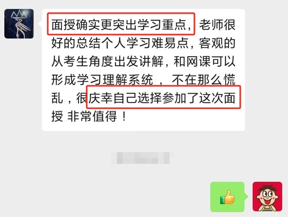 “面授确实更突出学习重点,跟好的总结个人学习重难点,客观的从考生角度讲解,很庆幸自己选择参加这次面授课,非常值得!”